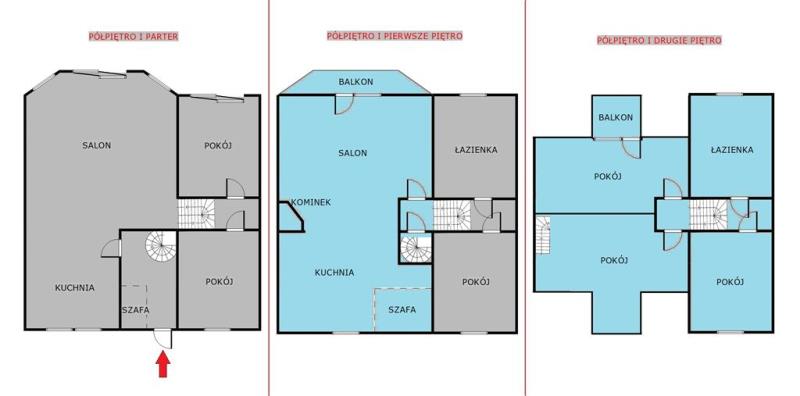 (Jedna część jest oznaczona na rzucie pomieszczeń kolorem szarym, druga część kolorem niebieskim. Rzuty pomieszczeń nie uwzględniają podpiwniczenia i poddasza).