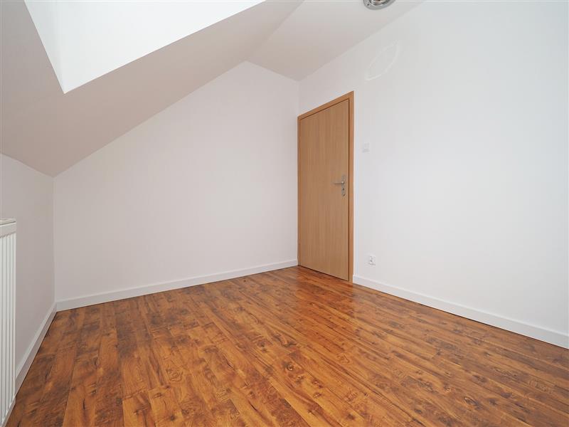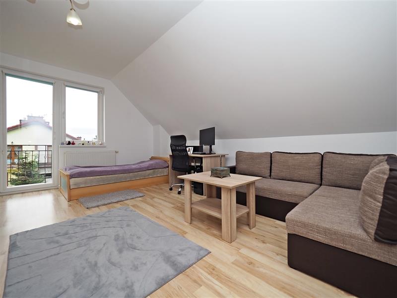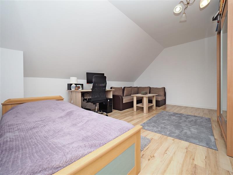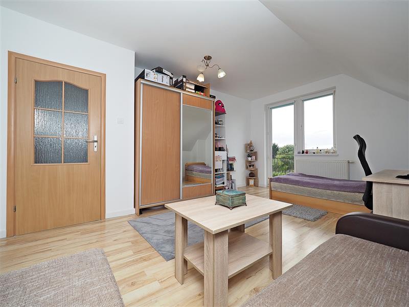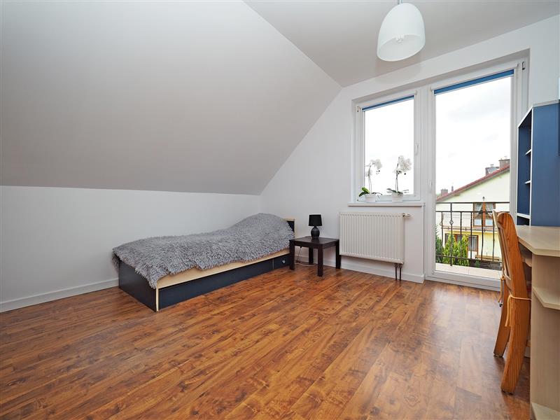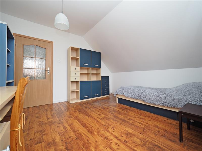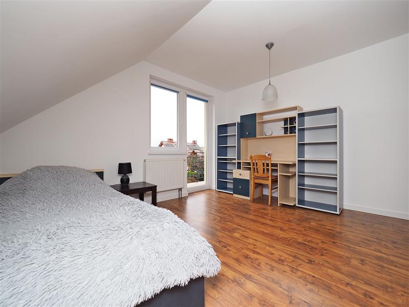 Na piętrze znajduje się przedpokój (ok. 6,73 m2), 3 sypialnie (ok. 13,24 m2, 10,09 m2, 9,75 m2), garderoba (ok. 3,7 m2) oraz łazienka z wanną (ok. 3,35 m2). Z 2 sypialni wyjście na wspólny balkon. W przedpokoju na piętrze znajduje się wejście na strych.
