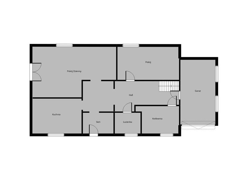 Na parterze mieści się sień(ok. 3,33 m2), hall wraz z klatką schodową(ok. 8,67 m2+2,17 m2), korytarz i schowek (ok. 2,95 m2). kuchnia (ok. 11,34 m2), pokój (ok. 12,23 m2), łazienka z prysznicem (ok. 2,88 m2), salon (ok. 25,87 m2) z wyjściem na ogród, pralnio-kotłownia (ok. 4,89 m2). W bryle znajduje się również garaż 1-stanowiskowy (ok. 18,61 m2).