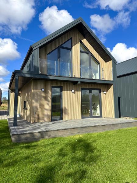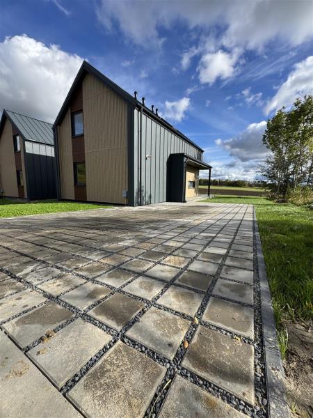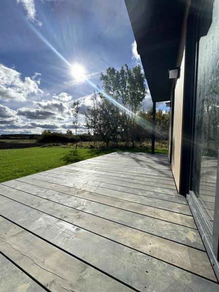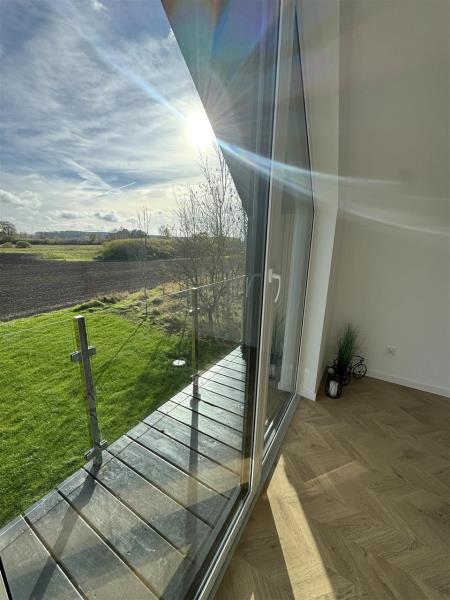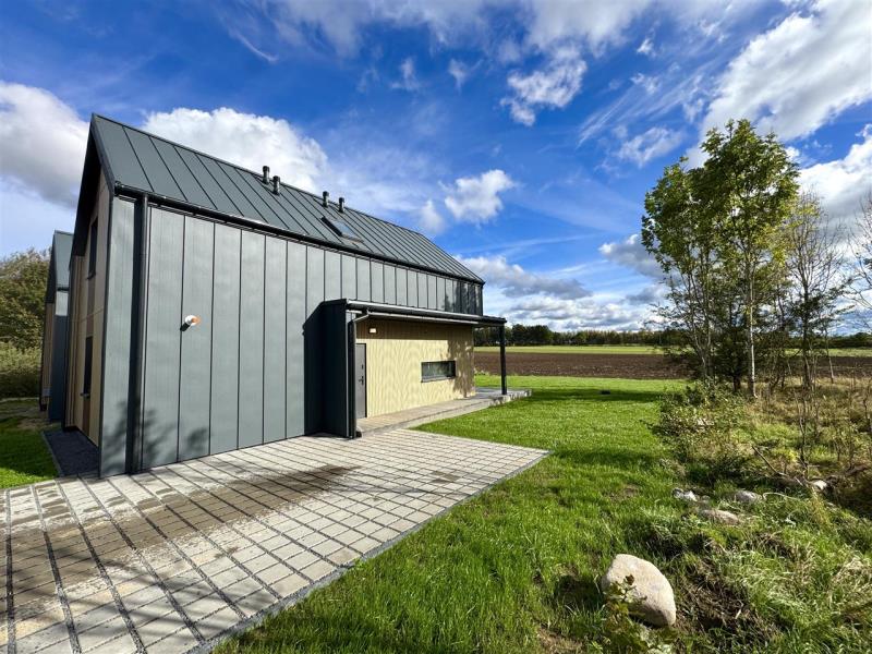 Architektura domu to połączenie nowoczesnego designu z dużą ilością przeszkleń, które pięknie doświetlają wnętrza i otwierają przestrzeń na otoczenie. Z salonu oraz sypialni rozciąga się piękny widok na otwartą przestrzeń i pola, co dodatkowo podkreśla kameralny i spokojny charakter tej lokalizacji.