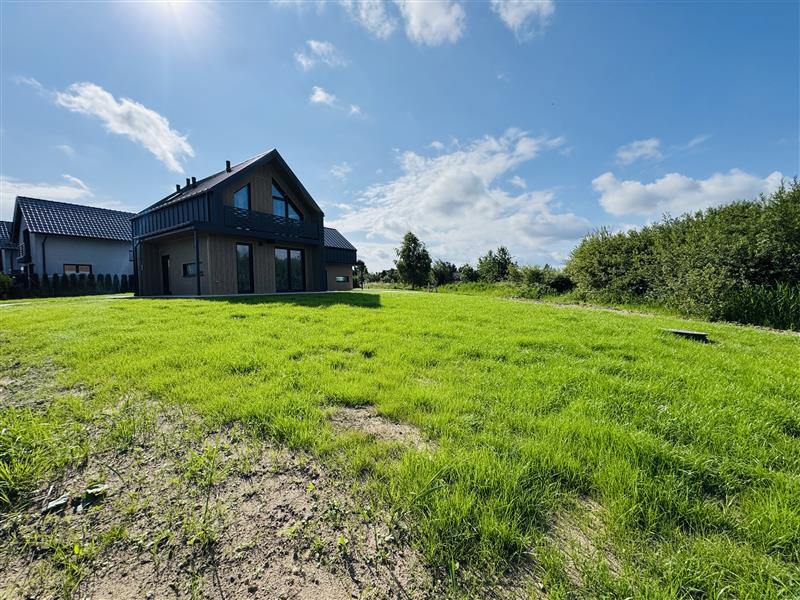 działka zagospodarowana- zasiana piękna, gęsta trawa, która tworzy zieloną, przyjemną przestrzeń wokół domu