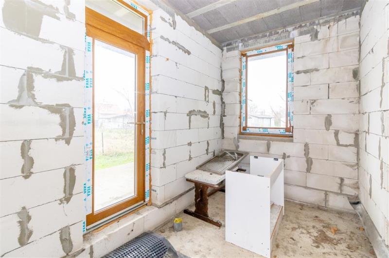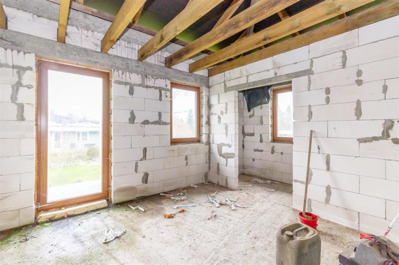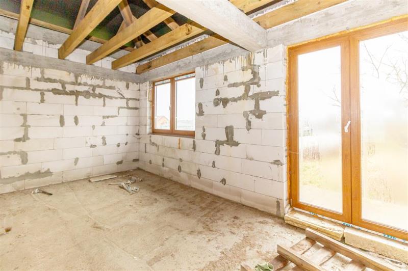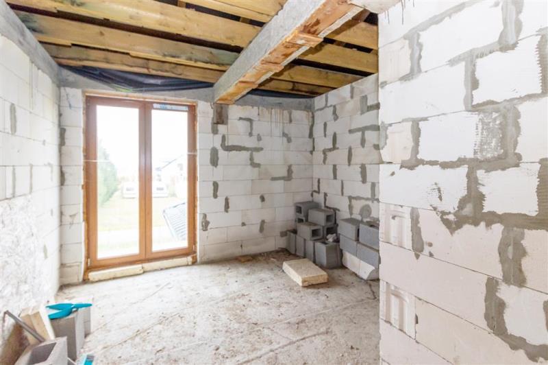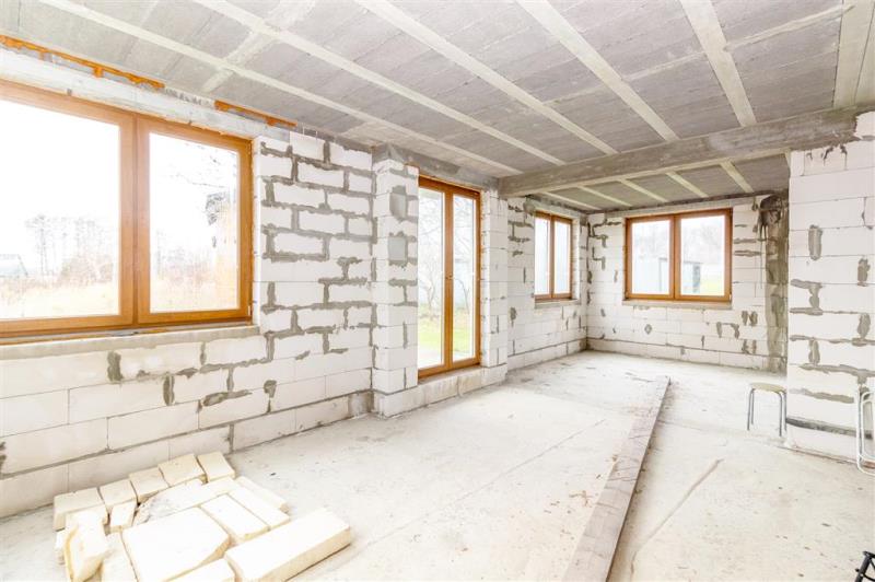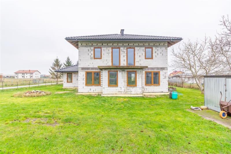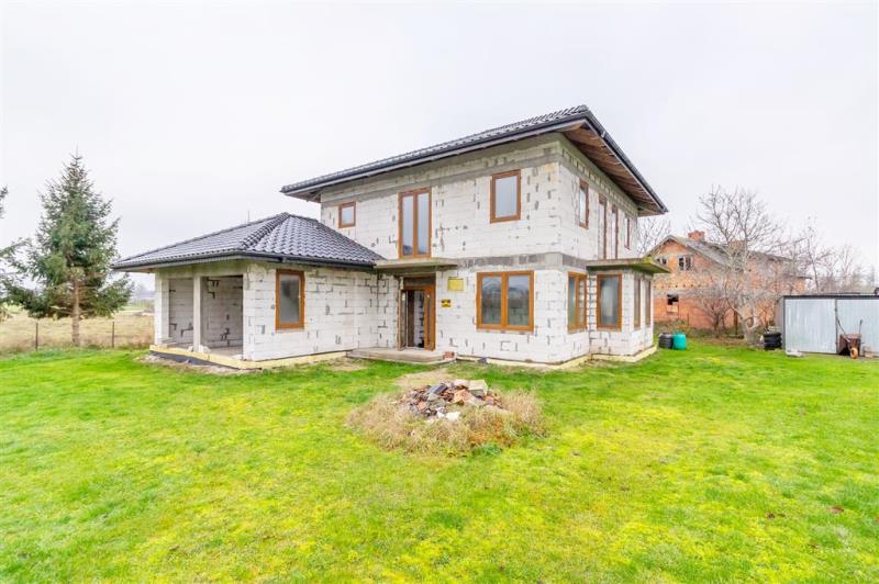 Dom wybudowany z betonu komórkowego, do wykończenia elewacji pozostało wykonanie ocieplenia i tynku. Przewidziane ogrzewanie gazowe w projekcie. Konieczność wybudowania szamba.