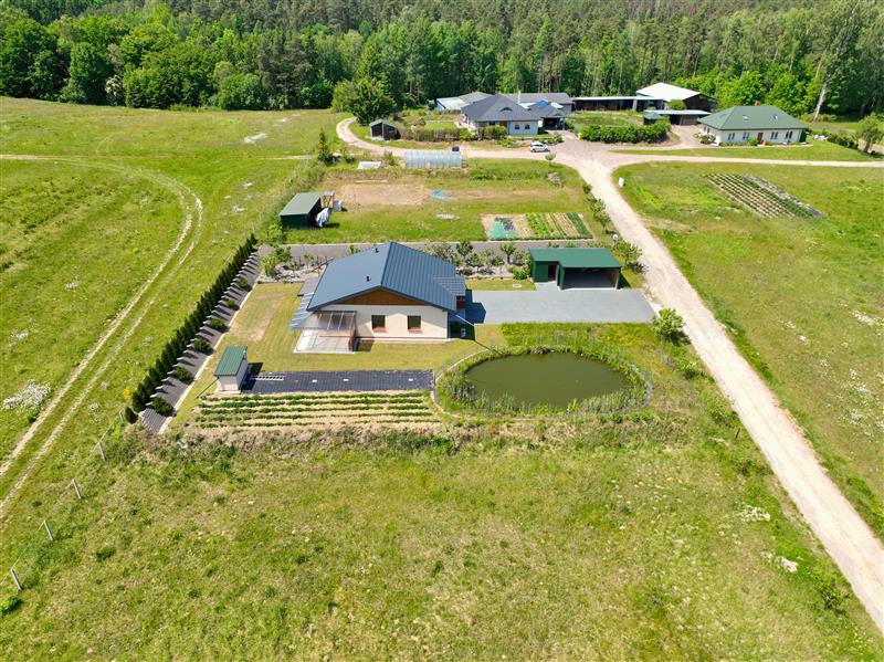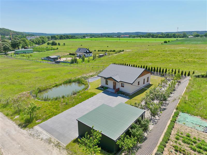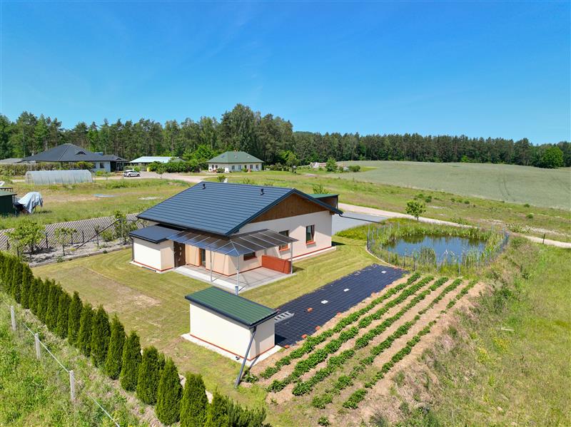 Przedmiotem sprzedaży jest parterowy dom jednorodzinny, wolnostojący sprzedawany w stanie deweloperskim o powierzchni całkowitej 83,40 m², posadowiony na przestronnej i w pełni zagospodarowanej działce o powierzchni 1500 m². Dodatkowym atutem nieruchomości jest murowana piwnica na terenie działki, wiata garażowa oraz oczko wodne.