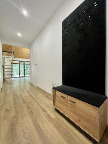 - Przestronny salon z dużymi przeszkleniami prowadzi na 50-metrowy taras z panoramicznym widokiem na taflę jeziora — idealny na poranną kawę, rodzinne spotkania czy romantyczne zachody słońca,