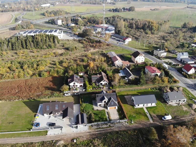 Prąd, woda, gaz i kanalizacja znajdują się w drodze z płyt jumbo – na wysokości ostatniego domu, około 70 metrów od granicy działki.