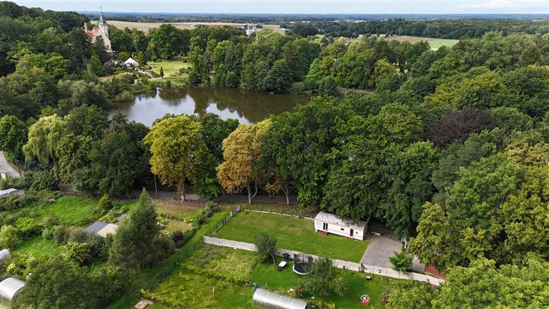 Działka w pobliżu alei pałacowej, z osobną bramą wjazdową, ogrodzona, otoczona drzewami. Na terenie domek holenderski, wybrukowany podjazd, nowoczesny garaż/szopa ogrodowa, zestaw wypoczynkowy. Wszystkie media: prąd, woda, szambo. Z działki widok na staw i Bursztynowy Pałac (https://pl.wikipedia.org/wiki/Pa%C5%82ac_w_Strzekecinie).