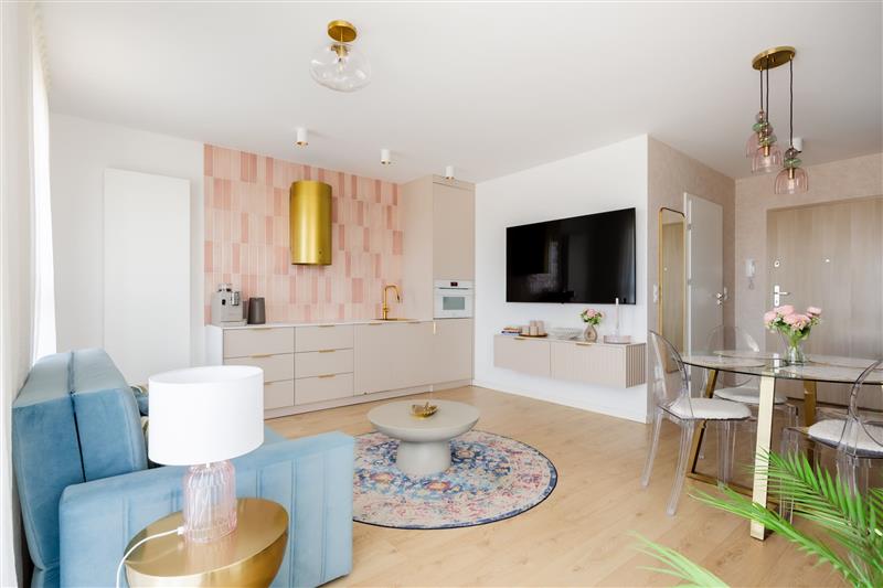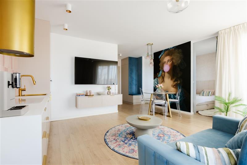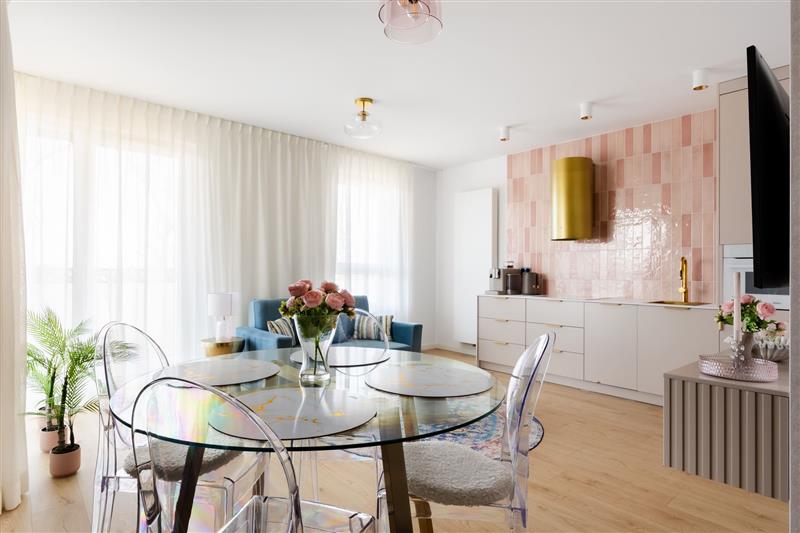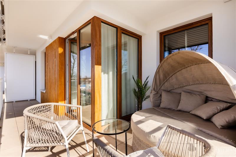 Mieszkanie zostało urządzone w wysokim standardzie, w nowoczesnym stylu i sprzedawane jest z wyposażeniem. Dużym atutem jest także przestronny balkon o powierzchni 11,56 m², który zapewnia dodatkową przestrzeń do wypoczynku.