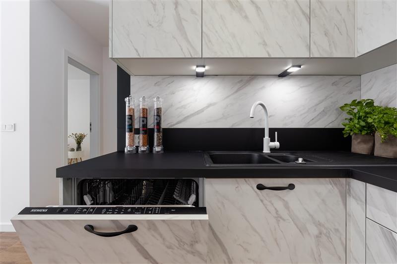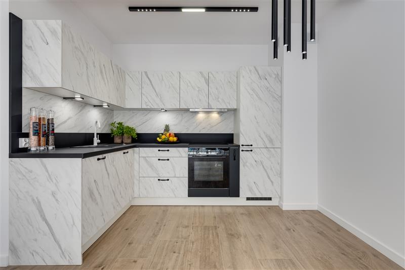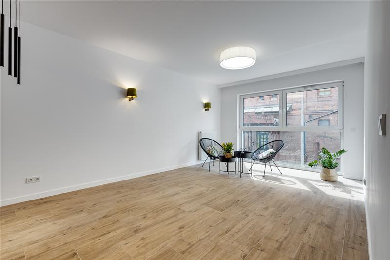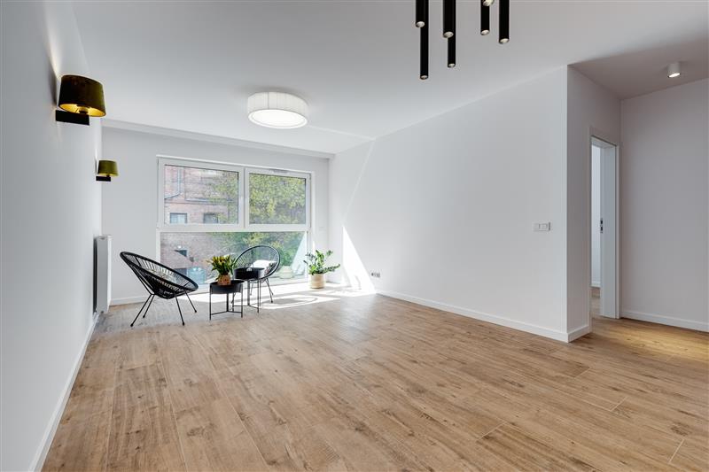 Lokal został wykończony pod klucz, z wysokiej jakości materiałów. Drzwi marki Dewro, włoskie płytki Marazzi i Imola w łazience i na podłogach w całym mieszkaniu, kuchnia oraz inne meble firmy Haecker, nowy sprzęt AGD w kuchni marki Bosch/Siemens, ceramika Duravit, oświetlenie Nowodvorski i AQform.