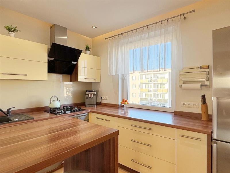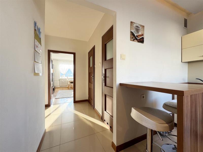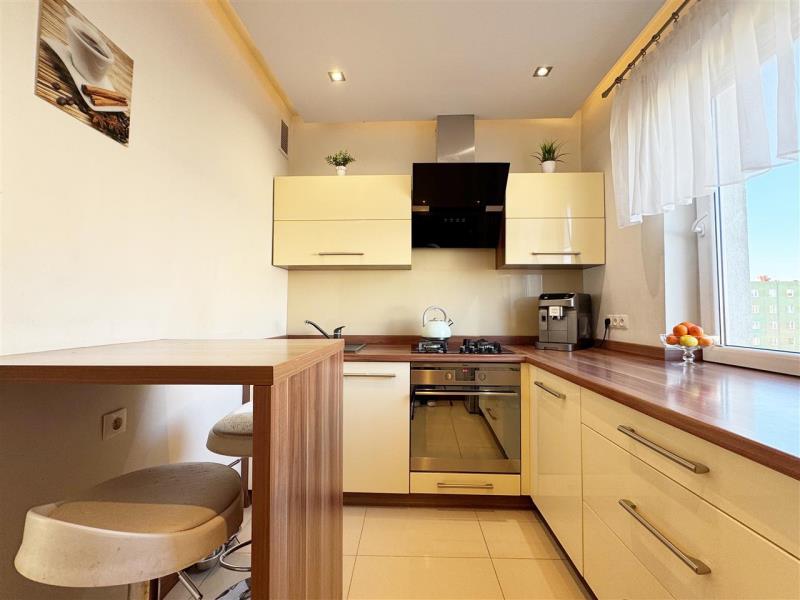 Kuchnia wyposażona i umeblowana: szafki wiszące i stojące na wymiar, barek/ stół, sprzęt AGD: kuchenka + piekarnik, zmywarka, lodówka, pozostają na wyposażeniu mieszkania.