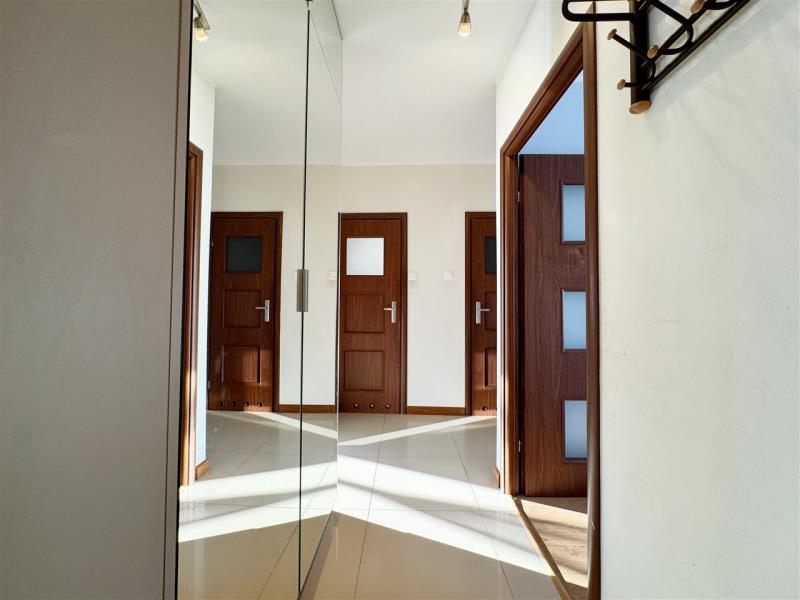 Przedpokój: na podłodze terakota, drzwi antywłamaniowe, szafa z przeszkleniem lustrzanym.