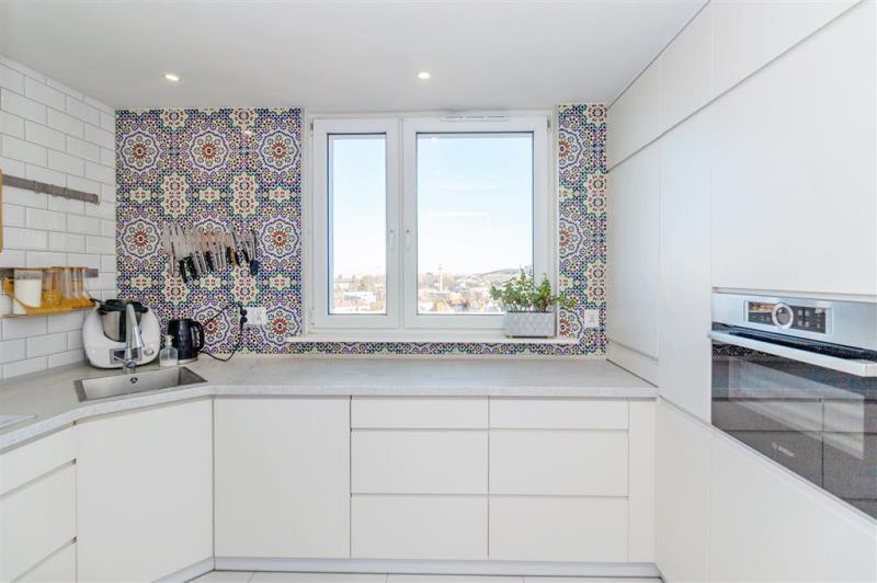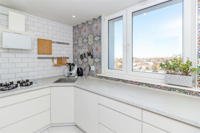 Mieszkanie usytuowane jest na 10 piętrze, natomiast prywatne wejście do mieszkania eleganckimi schodami i z małym przedpokojem znajduje się na poziomie 9 tego budynku.
