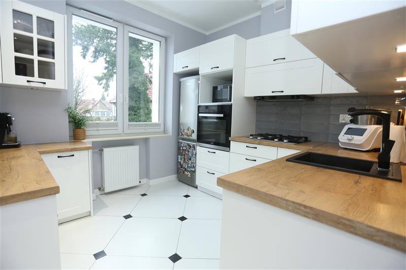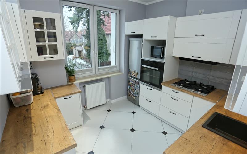 Kuchnia jest funkcjonalna i jasna, białe meble z drewnianym wykończeniem, nadają wnętrzu elegancji. Wyposażona jest w dobrej jakości sprzęty: lodówka, piekarnik, zmywarka, co zapewnia wygodę i ułatwia codzienne gotowanie.