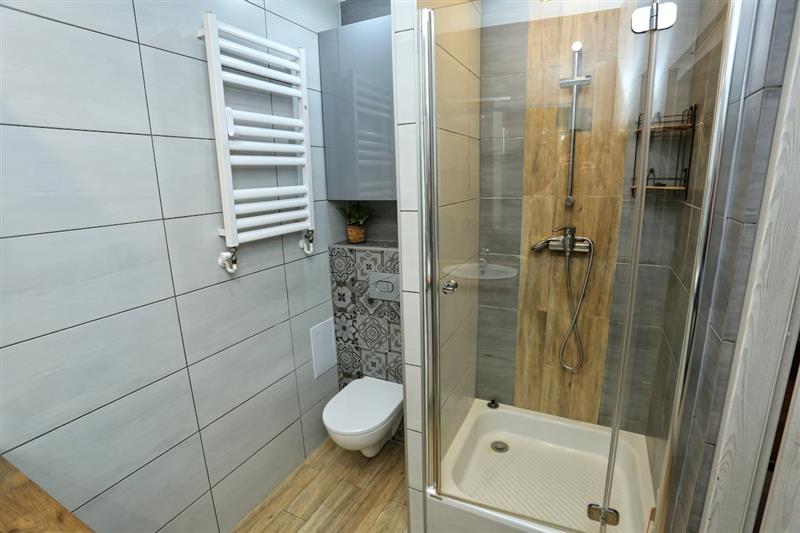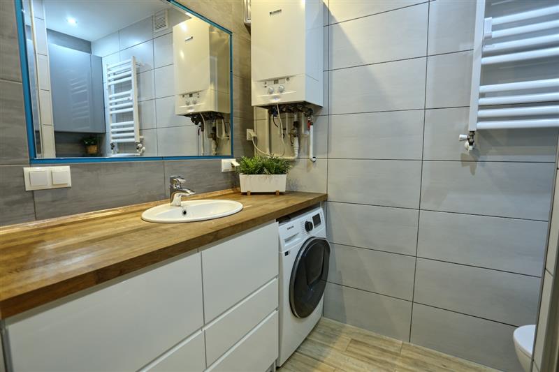 W łazience znajduje się duża kabina prysznicowa oraz piękna zabudowa pod umywalkę i miejsce na pralkę.
