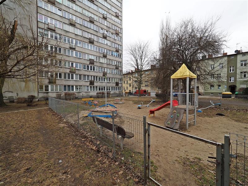 - ładny plac zabaw przed budynkiem.