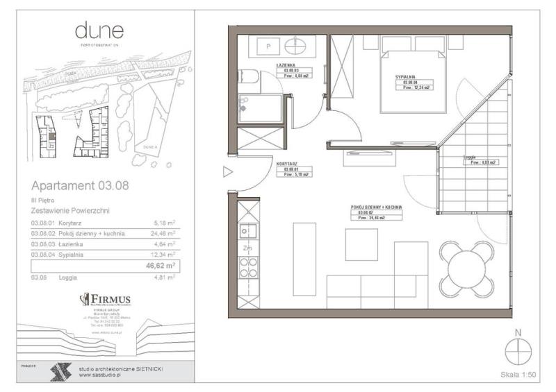 - powierzchnie pomieszczeń: salon z kuchnią 24,46m2, sypialnia 12,34m2, łazienka z wc 4,64m2, korytarz 5,18m2, loggia 4,81m2;