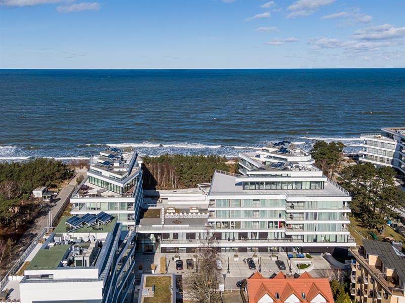 Apartament położony jest na III piętrze bezpośrednio przy promenadzie nadmorskiej i plaży w nowoczesnym V-kondygnacyjnym budynku apartamentowym DUNE B zrealizowanym w 2018r., w którym znajdują się apartamenty na kondygnacjach od parteru do V-go piętra, elegancka restauracja, siłownia oraz część SPA z basenem wewnętrznym, natomiast na kondygnacji podziemnej zlokalizowana jest hala garażowa z miejscami postojowymi.