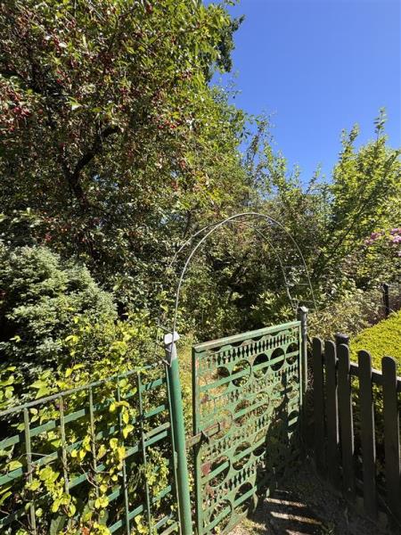 Część działki zagospodarowana na ogród z drzewami, krzewami owocowymi w tym część wypoczynkowa.