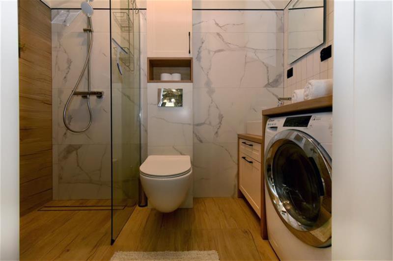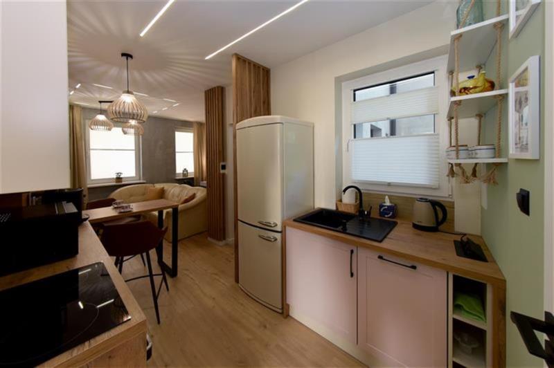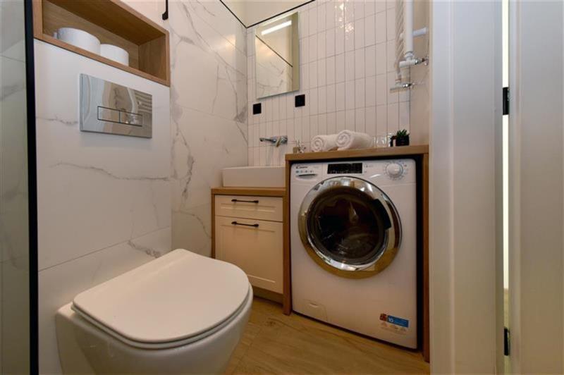 Kuchnia: pełne wyposażenie AGD (lodówka, zmywarka, mikrofala, piekarnik oraz ciśnieniowy ekspres do kawy).