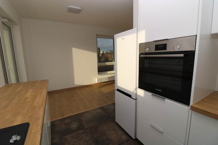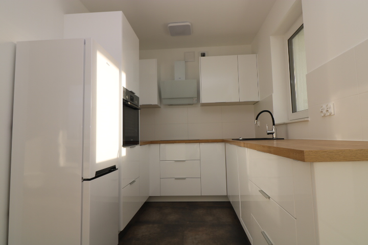 Kuchnia w pełni umeblowana i wyposażona w sprzęt AGD -zmywarka, piekarnik, płyta indukcyjna, lodówka, pochłaniacz.