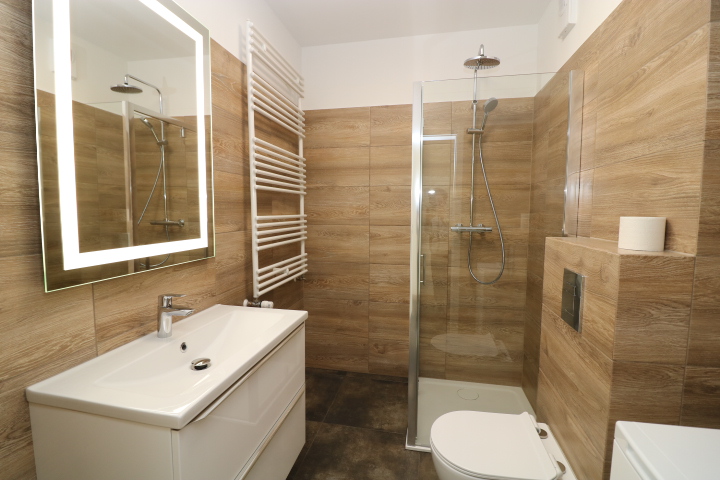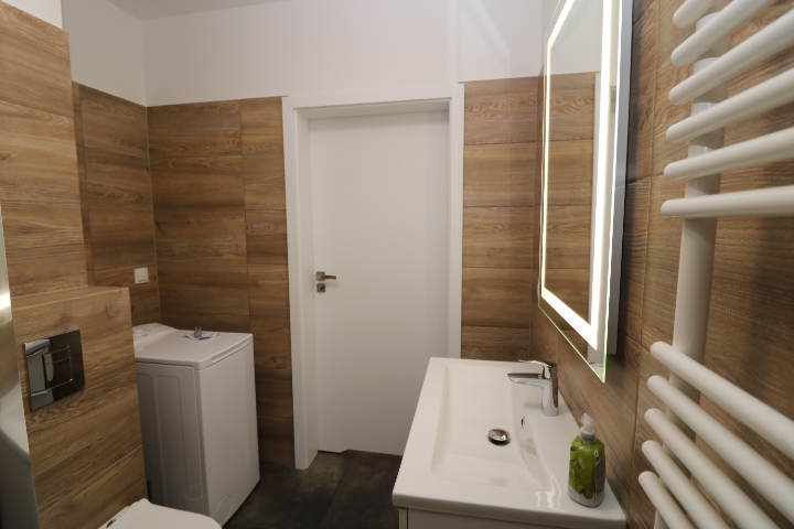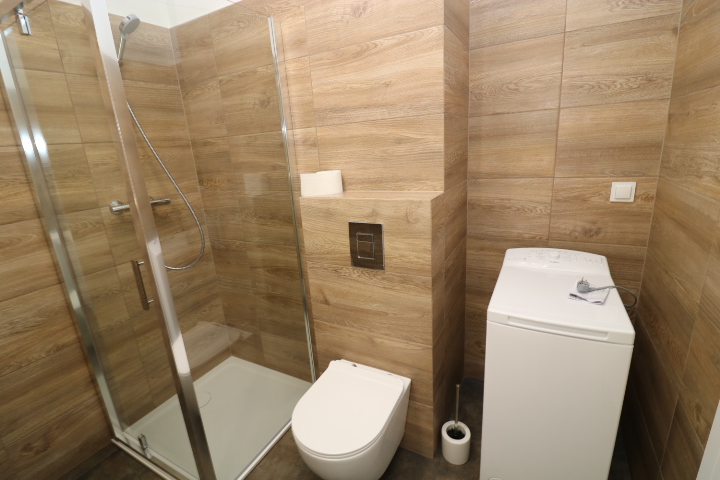 Łazienka kompletna, kabina prysznicowa, pralka.